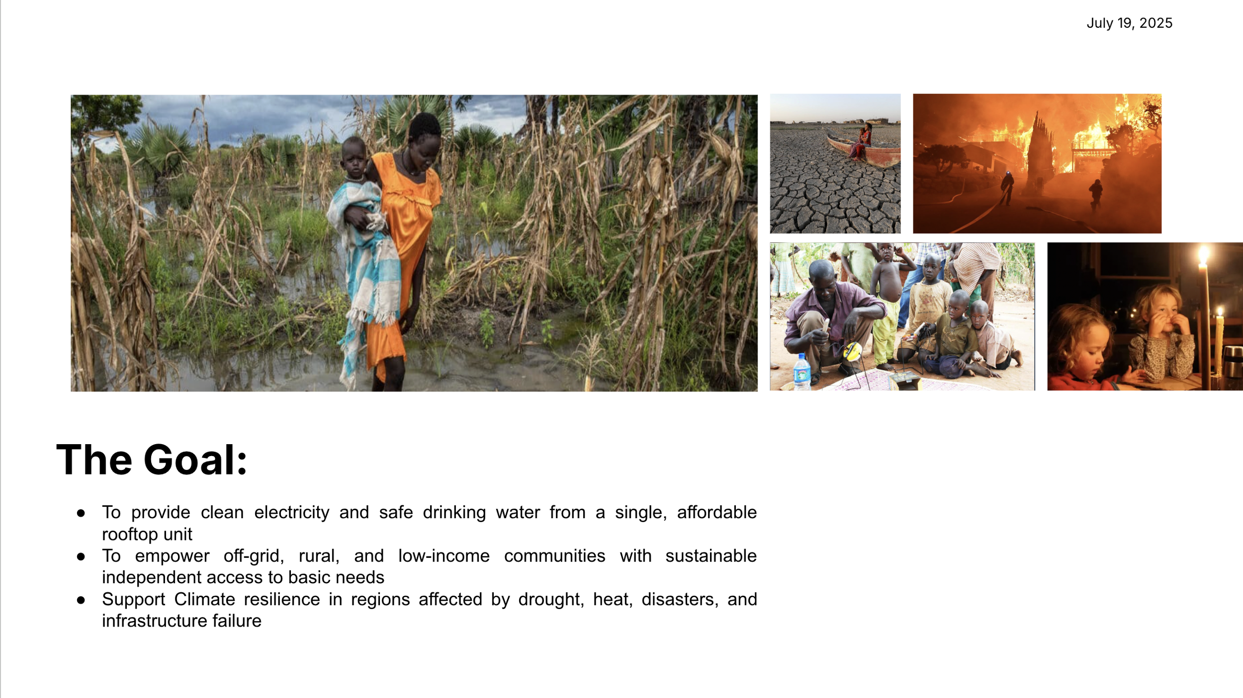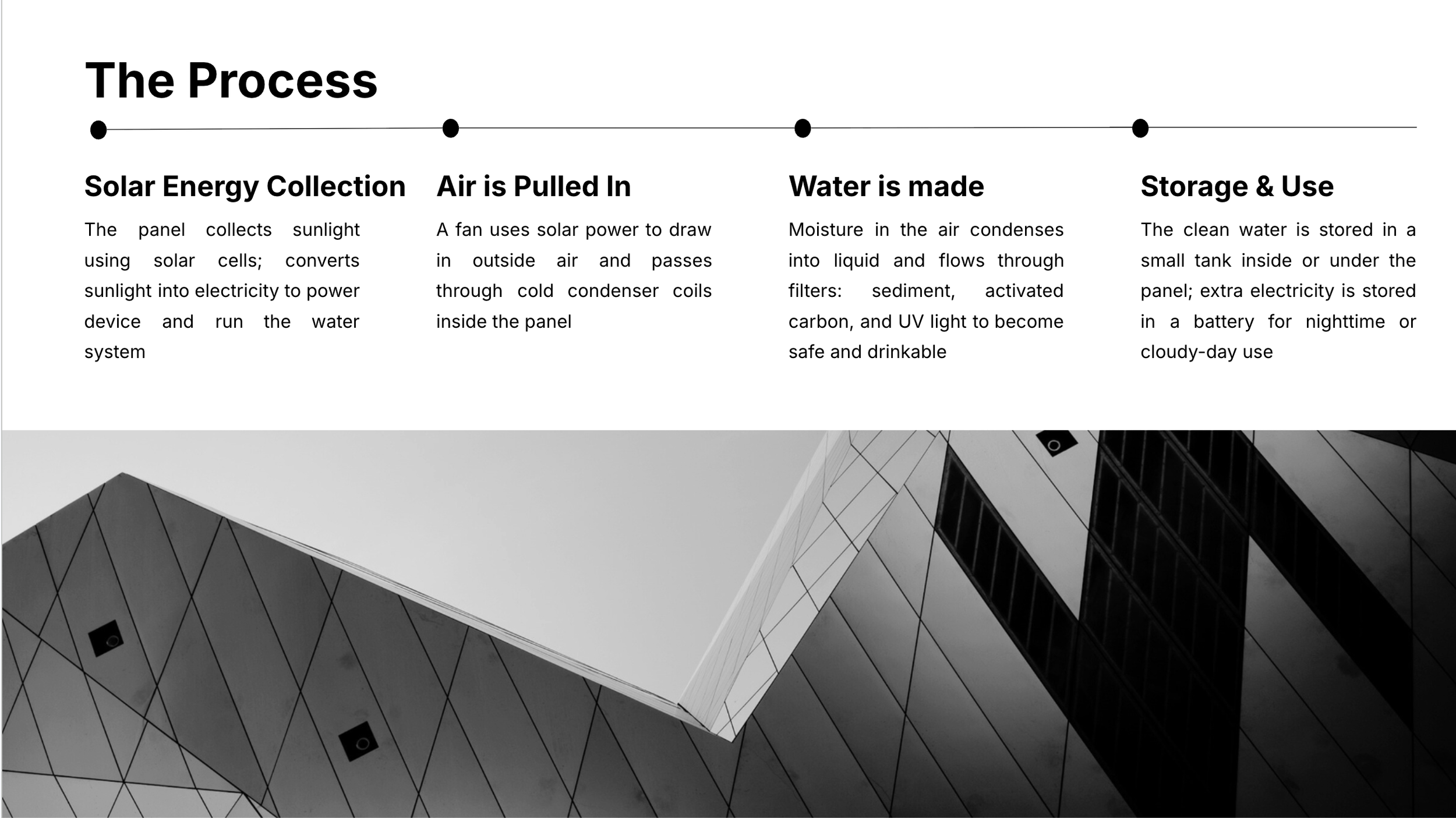 This solar roofing system serves a dual purpose: to generate electricity and produce purified drinking water. The solar panel powers the water condenser, which extracts water from the humidity of the air. The excess electricity can power homes. The HydroVolt is made of recycled plastic materials, which reduces the amount of plastic pollution in landfills and oceans. The HydroVolt Panels can help reduce the global carbon footprint and provide clean energy and water for homes and off-grid communities. In low income and drought, these panels can significantly reduce dependence on external utilities and help overcome both water scarcity and energy poverty.